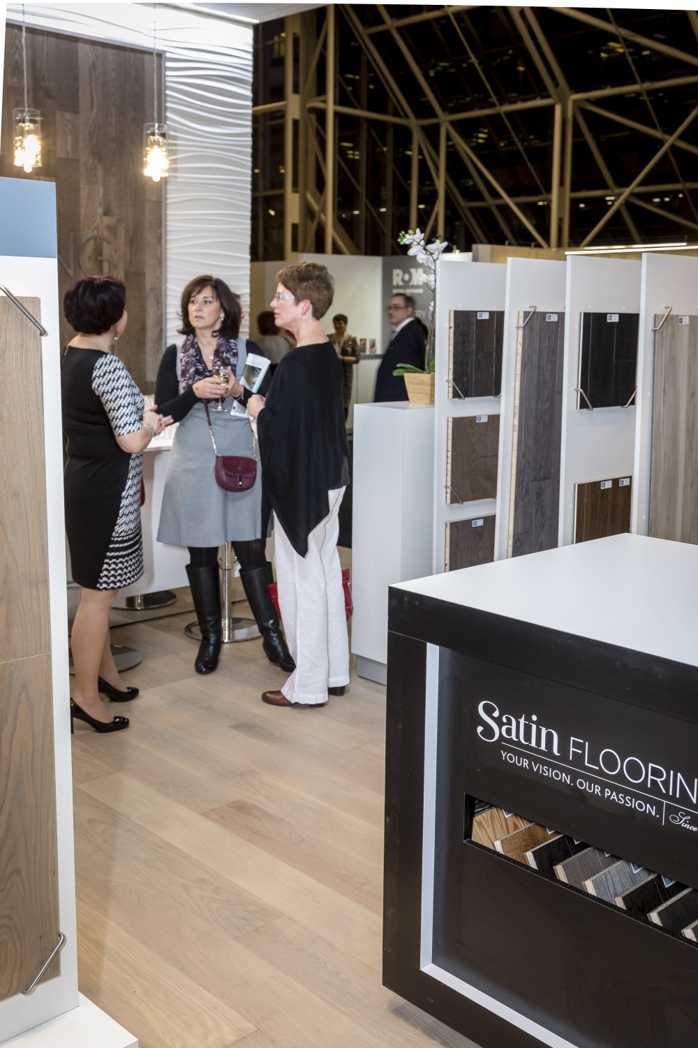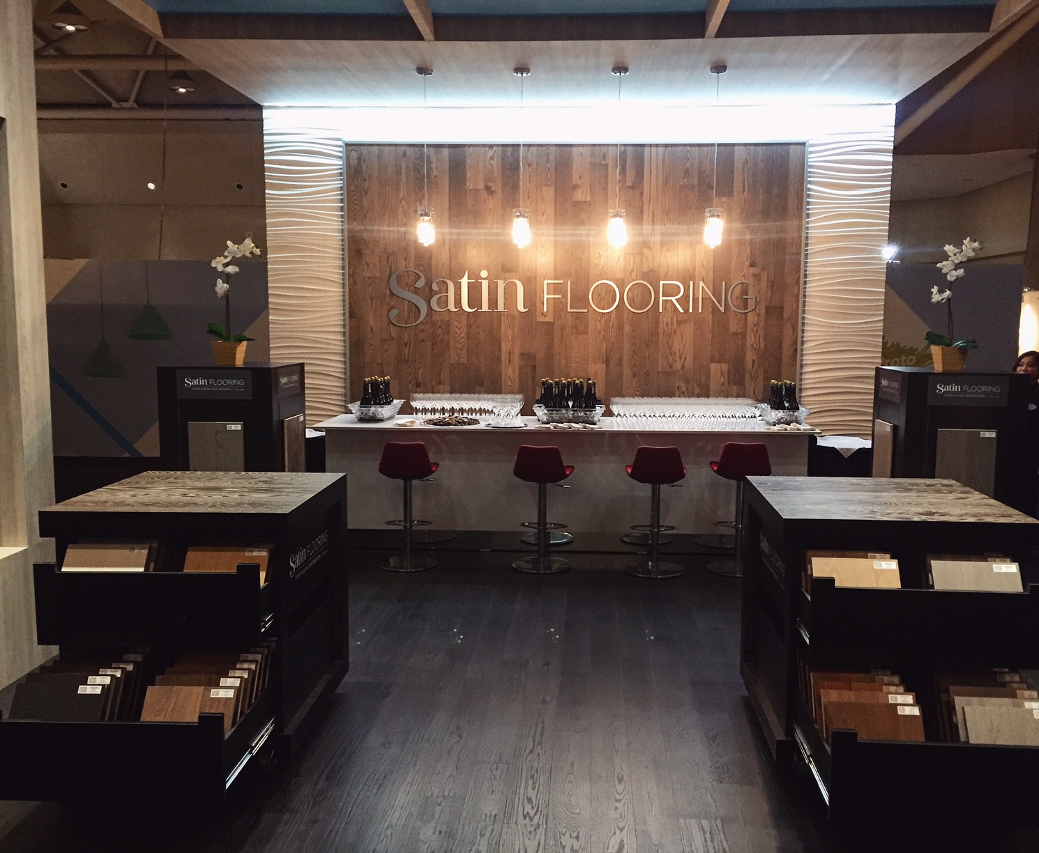 We were especially thrilled to have Decora 3D Wall by Satin Flooring, one of our newest products, featured as our back wall. The 3D wall sparked a lot of interest as the look adds beautiful texture and interest to walls
